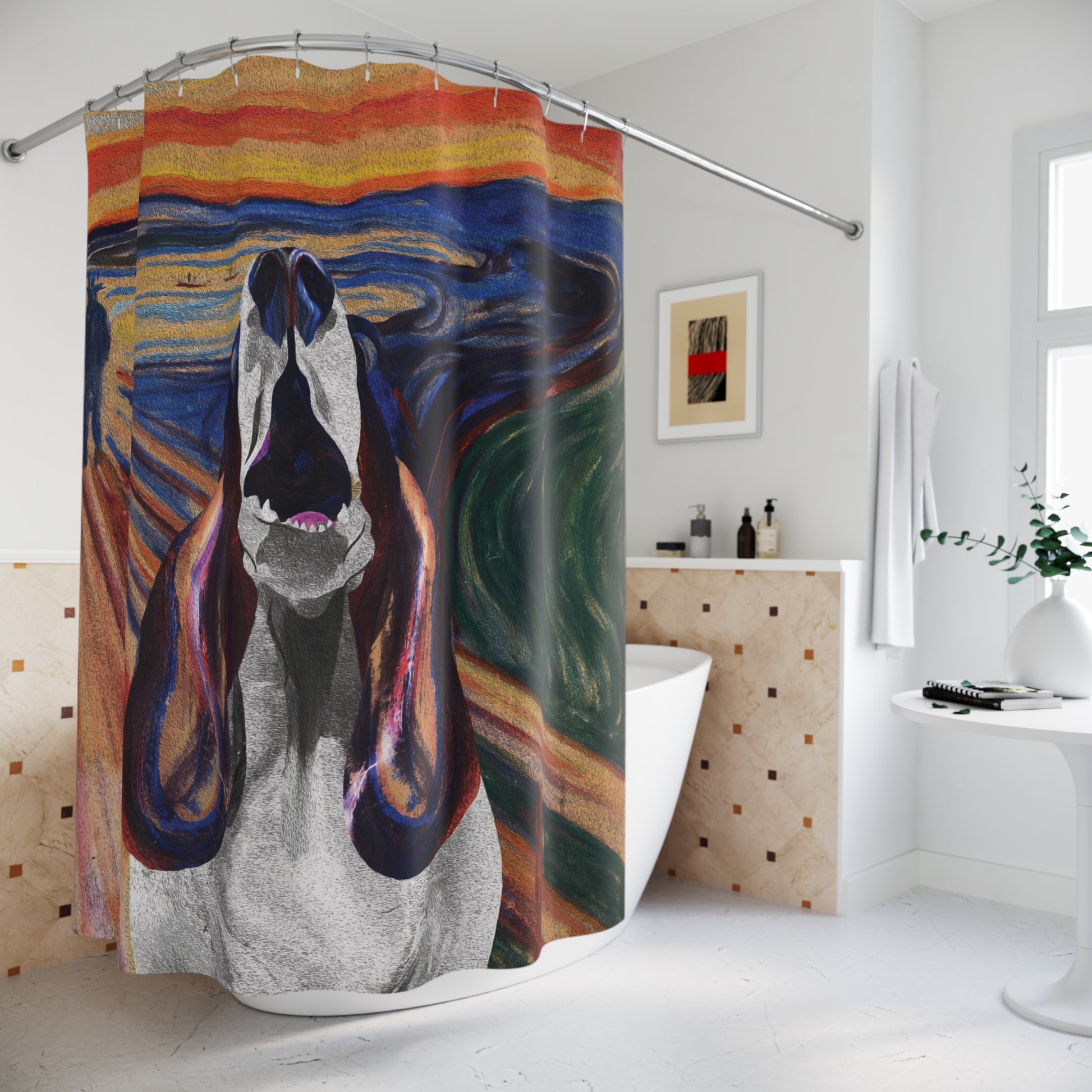 Do you love basset hounds and 'The Scream' by Edvard Munch? Then transform your bathroom into an art museum with this alternative take on Munch's masterpiece. Made from durable 100% polyester, it brings a unique touch to your space while providing essential privacy. The striking design adds a burst of color and creativity, making your daily routine feel like a luxurious retreat. Perfect for art lovers and those who appreciate bold statements in home decor, this shower curtain is a delightful addition to any bathroom. Ideal for occasions such as housewarmings, birthdays, or as a thoughtful gift for friends and family during holidays, this piece elevates your bathroom’s ambiance and draws the eye with its beautiful, one-sided print.